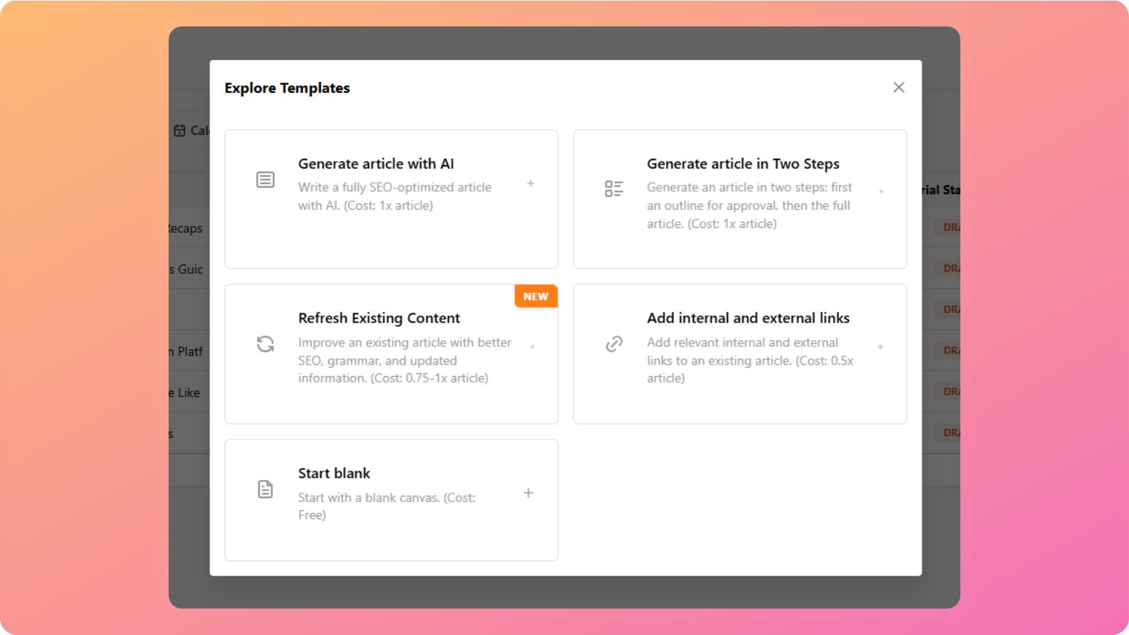 The Article Wizard is where all content creation in Contentpen begins. It gives you multiple ways to create, improve, or manage articles depending on your workflow and goals.