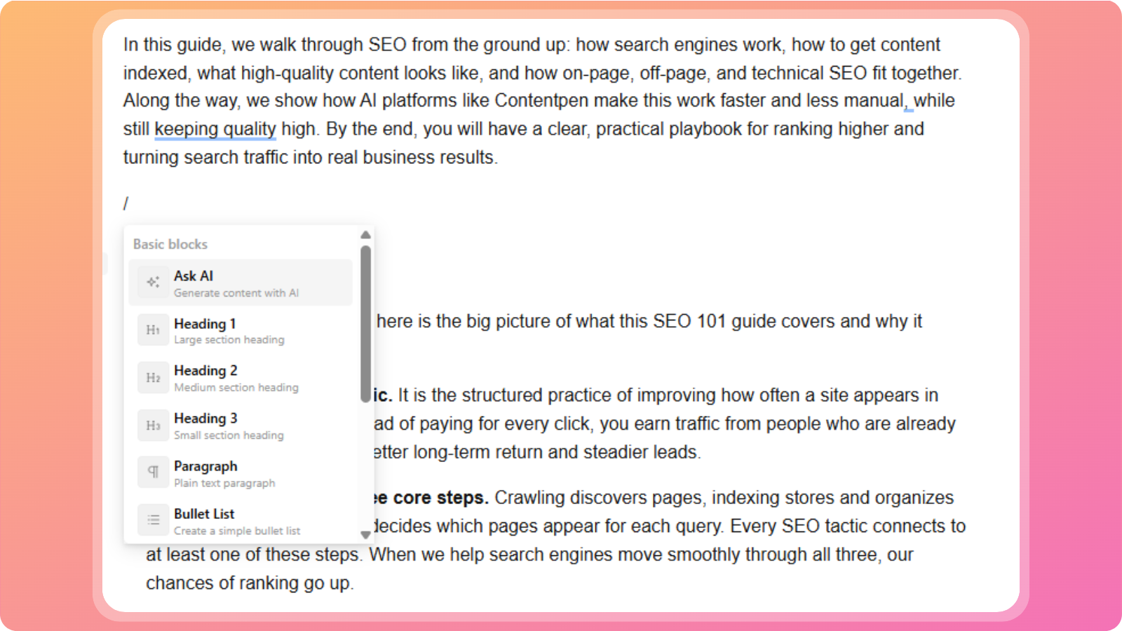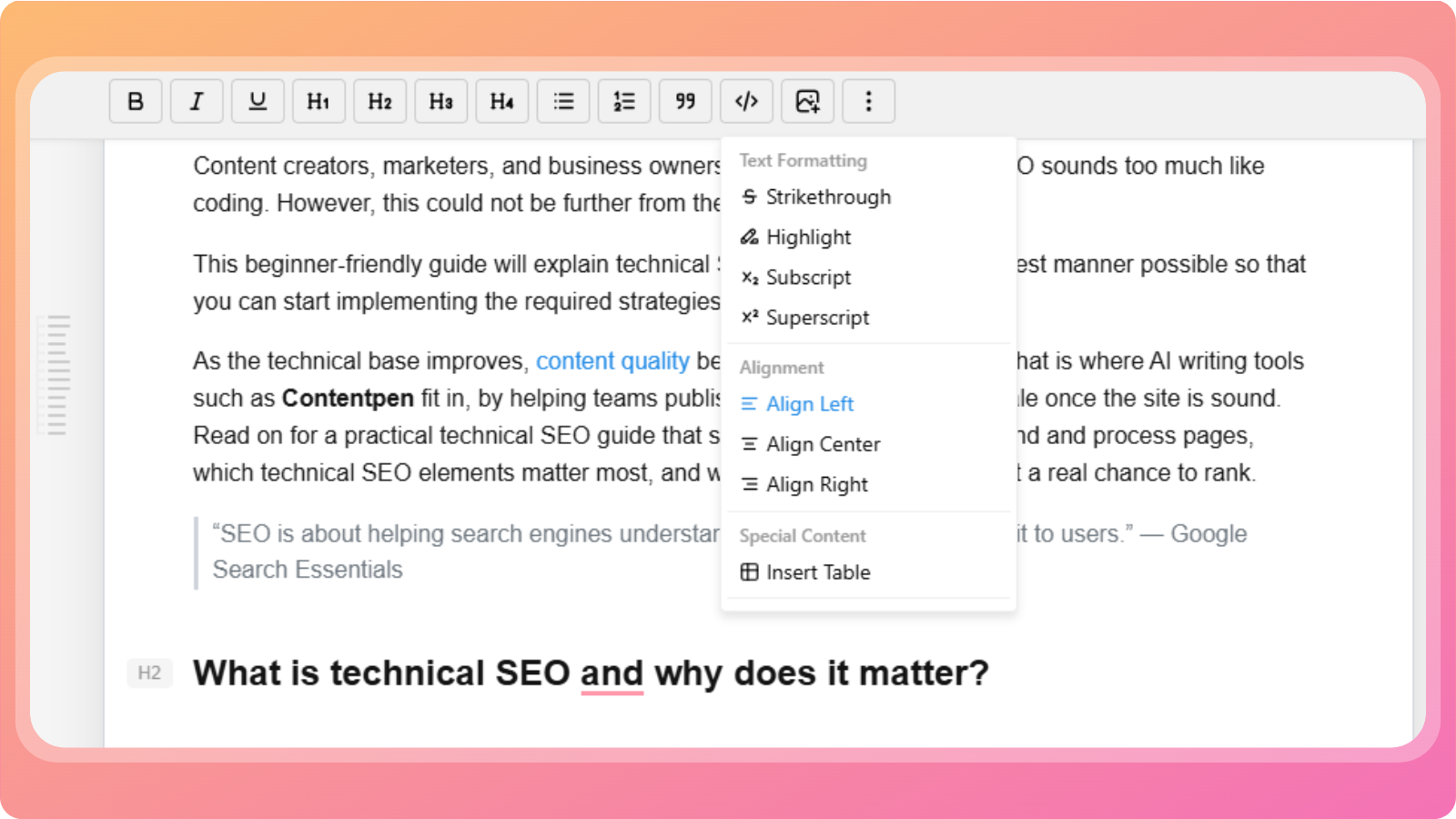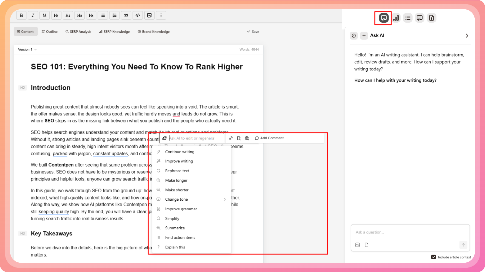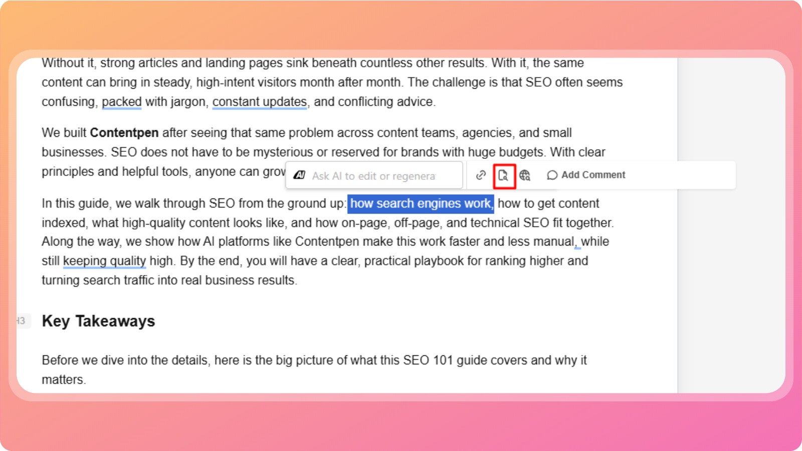 Once your article is generated, Contentpen opens it in the Live Content Editor. This editor lets you review, edit, and enhance your content in real time, similar to tools like Google Docs or Microsoft Word, but built specifically for content and SEO workflows.