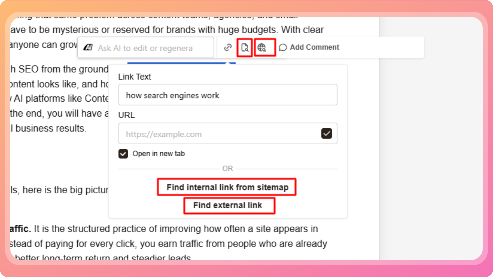 Add an internal link relevant to the selected text