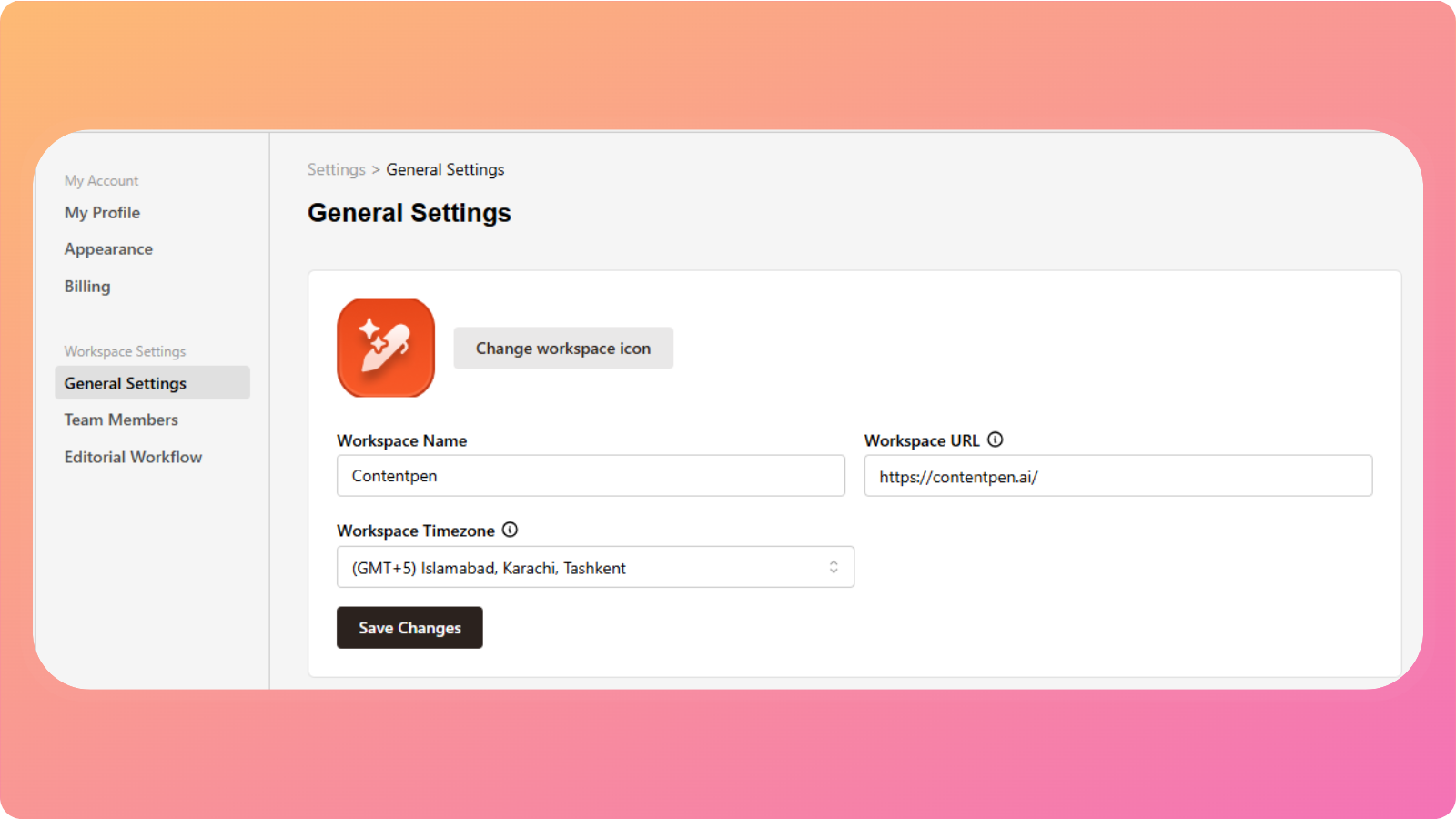 Workspace Settings handle basic workspace details, but brand voice and content-related preferences are managed separately.