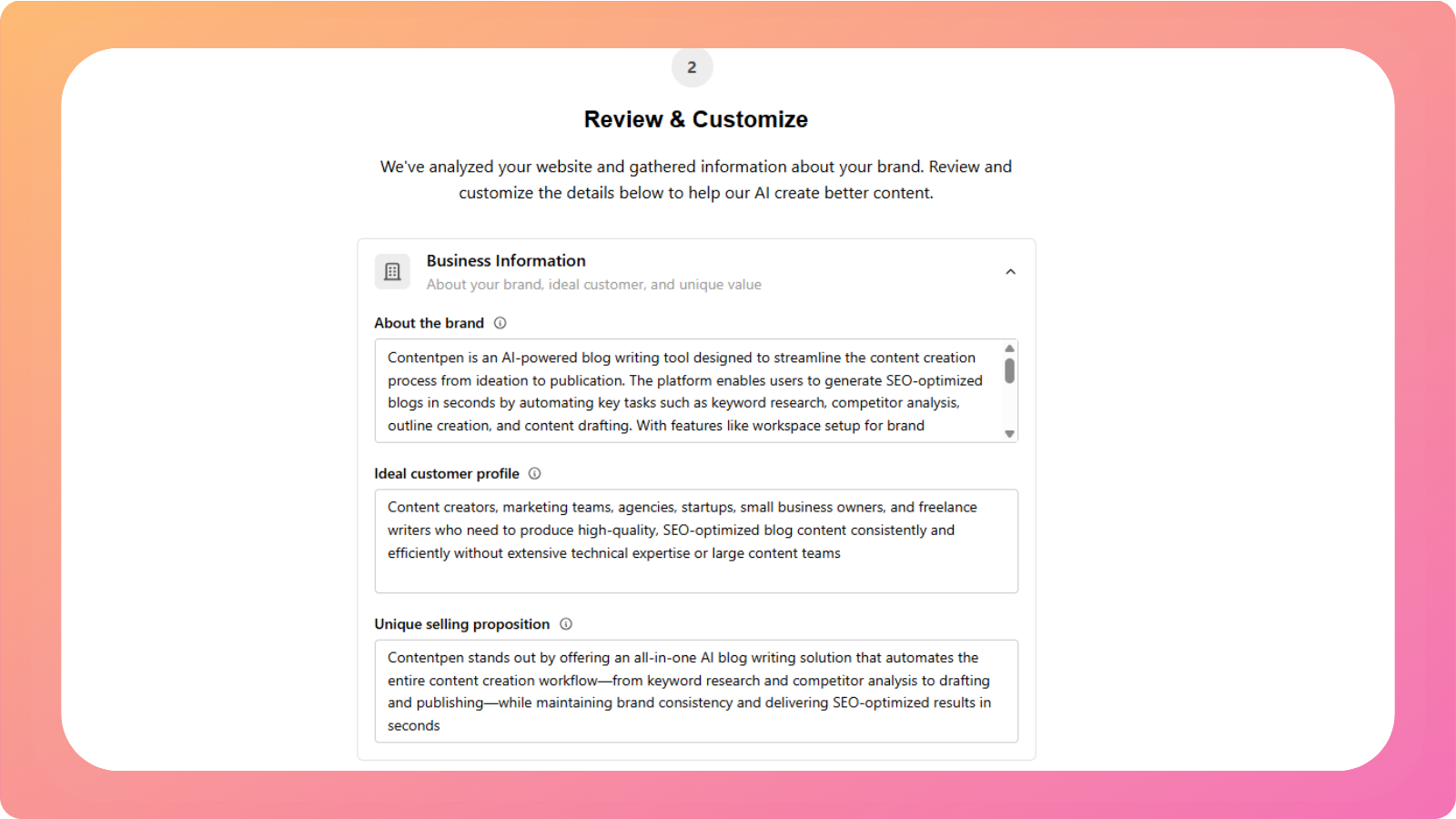 Once the analysis is complete, Contentpen will show you AI-generated suggestions based on your website, including: