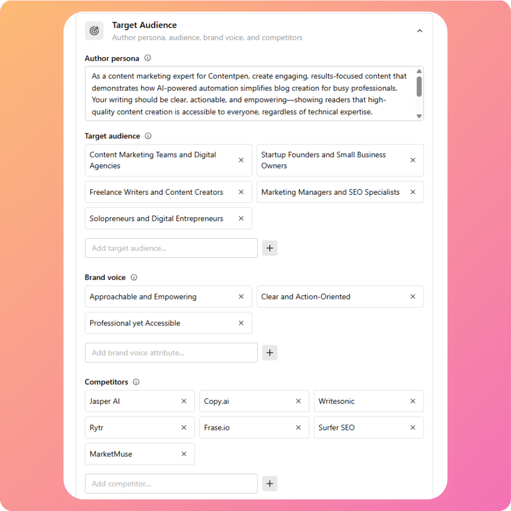 Competitors: Identifies competing brands or websites to help Contentpen understand the content landscape and positioning.