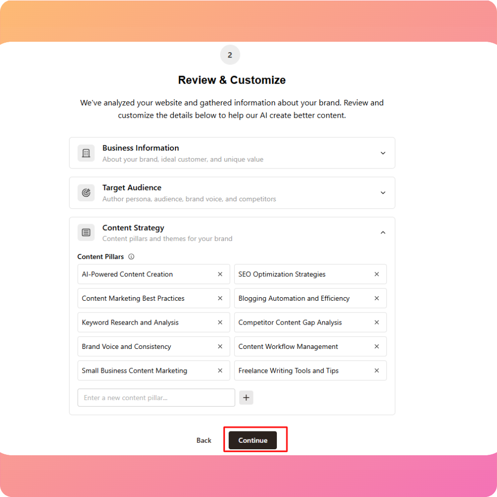 After this, Contentpen’s AI will start analyzing your website to understand your business, content style, and audience.